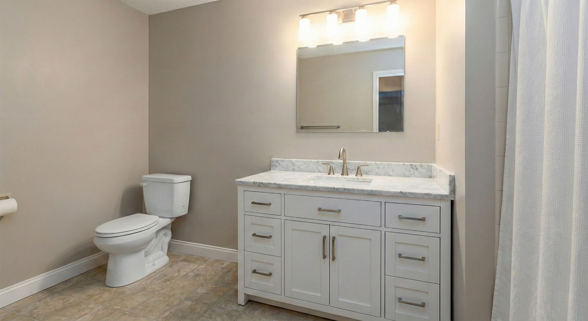 Small half-bath vs. spacious master — square footage drives material quantities.