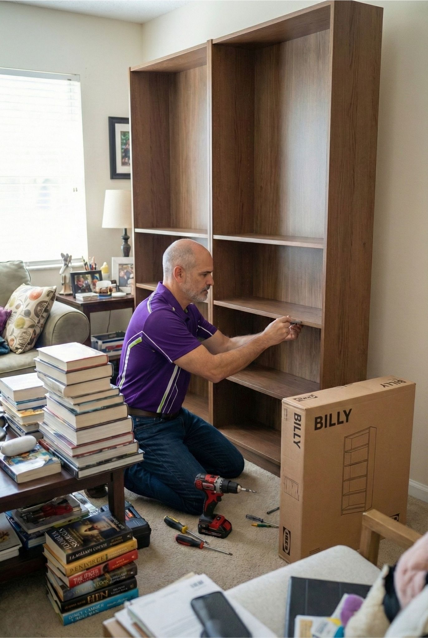 "Very polite and careful with our floors. They anchored the bookshelves to the wall for safety too."